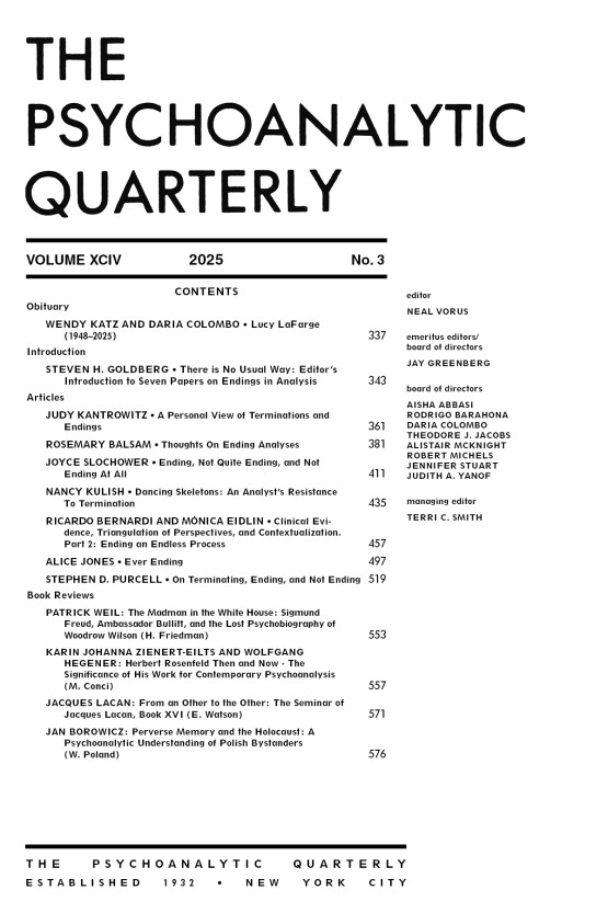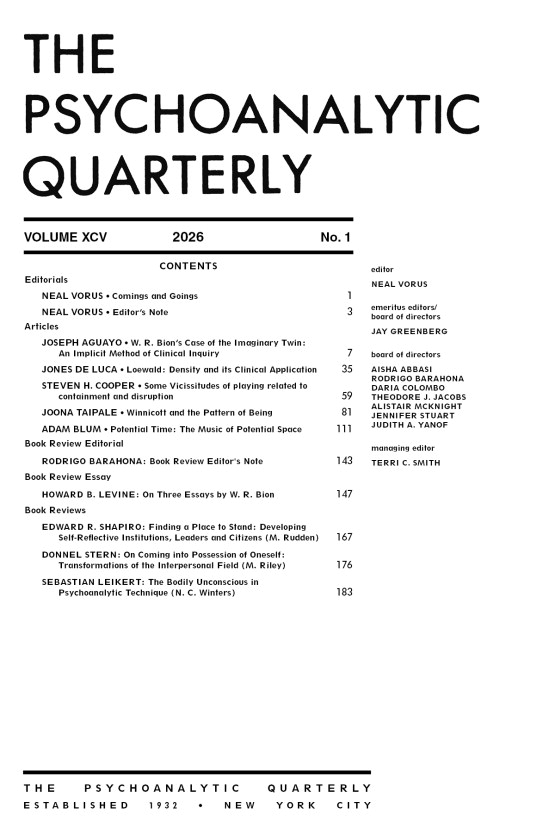 The oldest free-standing psychoanalytic journal in North America, The Psychoanalytic Quarterly is published every January, April, July, and October. Each issue contains from six to eight original articles, a section of in-depth book reviews, and a unique series of abstracts summarizing selected international journals and correlations with the neurosciences. A special section of the Quarterly is devoted to the examination of clinical process from a variety of viewpoints, utilizing presentations of case material.